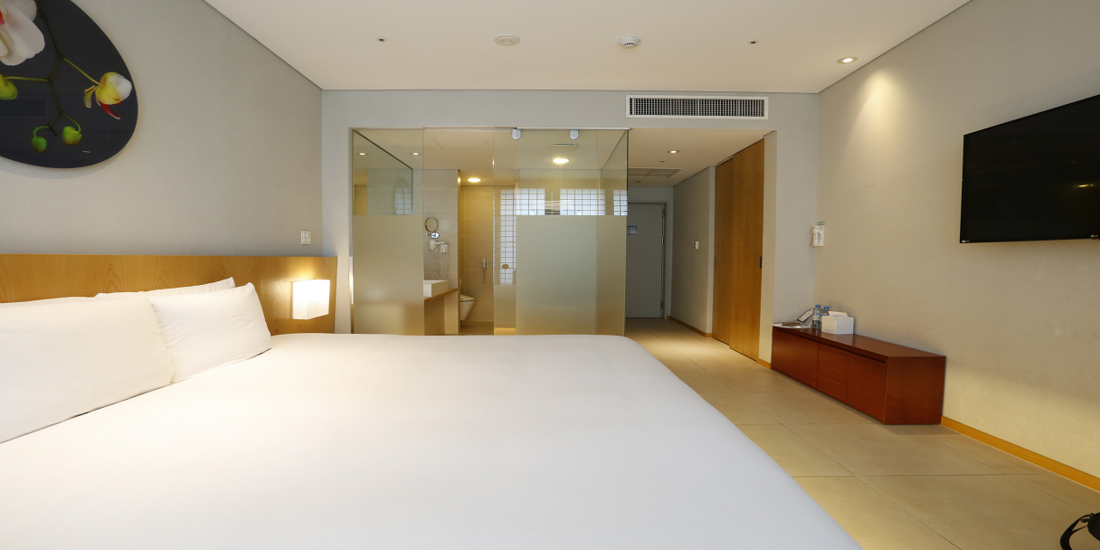 침실 유무선인터넷, 모닝콜, LCD 스크린, 리모콘 TV, 개인 금고, 멀티어답터, 스탠드, 업무용 책상, 침대, 음성메일, 가습기, 다리미, 냉 난방 시설, 개폐 가능한 창문, 전화