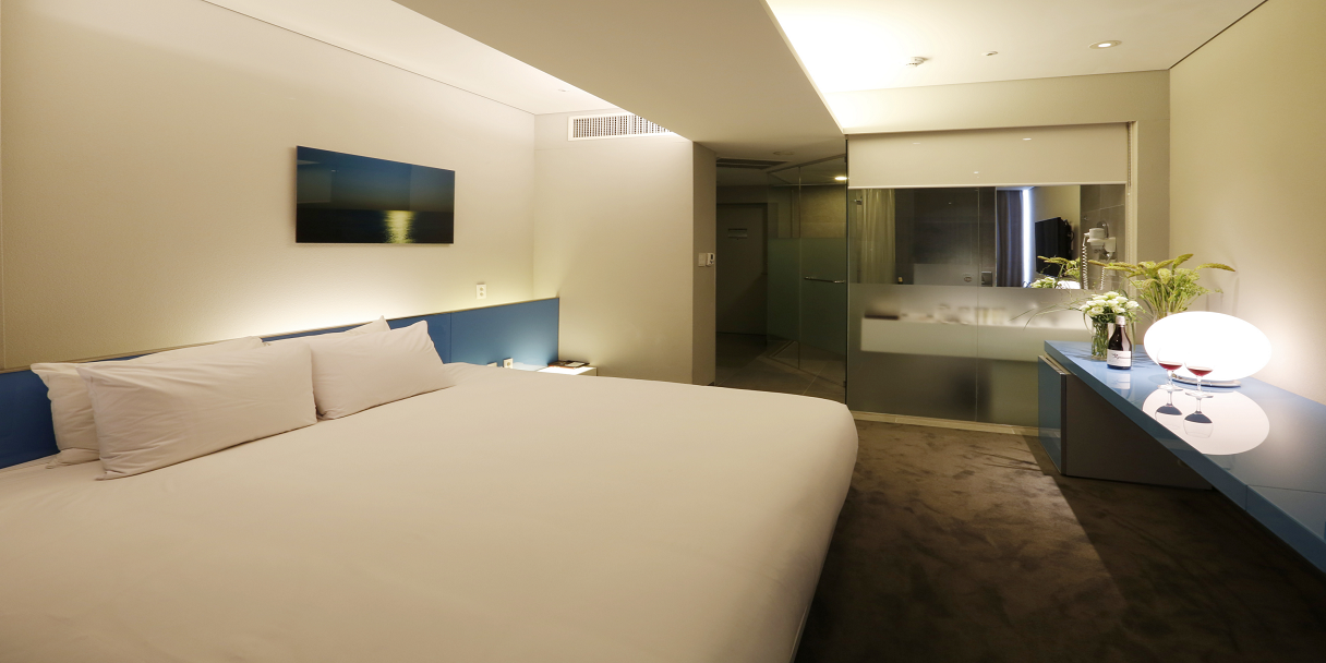 블루 스카이 룸의 디자인 컨셉은 우주 스페이스를 형상화한 컨셉으로 블루와 메탈의 매치를 통해 하늘과 우주 그리고 메탈 실버로 미래지향의 느낌을 강조한 객실 디자인 입니다.
