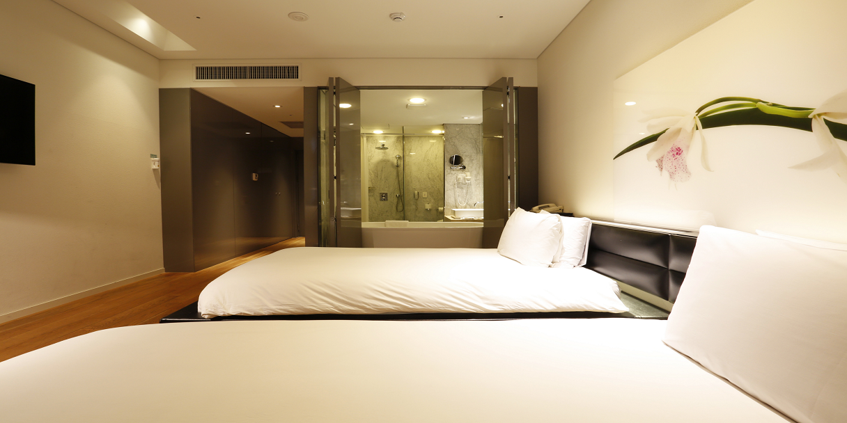 침실 유무선인터넷, 모닝콜, LCD 스크린, 리모콘 TV, 개인 금고, 멀티어답터, 스탠드, 업무용 책상, 침대, 음성메일, 가습기, 다리미, 냉 난방 시설, 개폐 가능한 창문, 전화