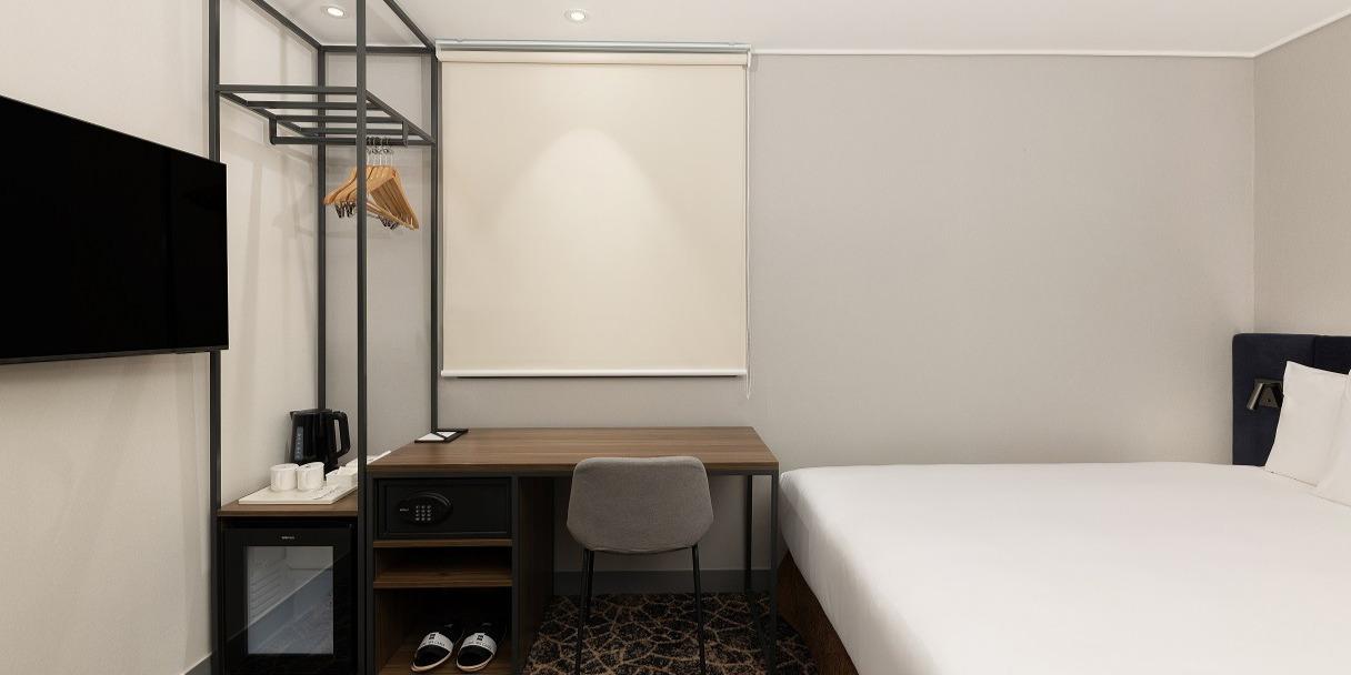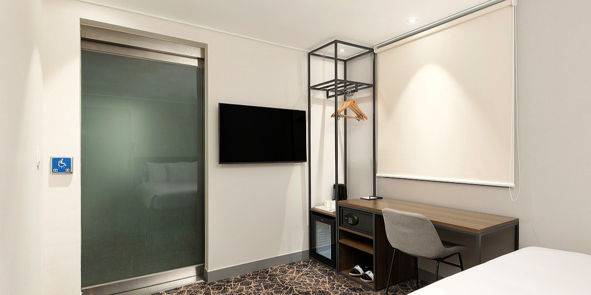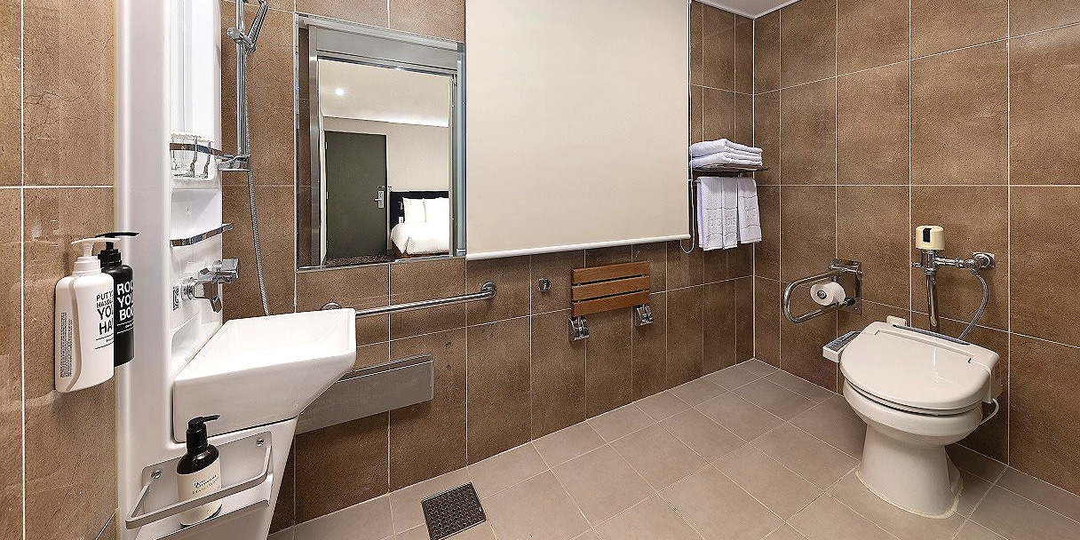 여행객과 비지니스맨의 피로를 풀 수 잇는 편안하고 아늑한 공간과 더불어 휠체어를 이용하시는 고객님들을 위하여 욕실 문을 슬라이딩 도어로 제작하여 이동이 편리하며 버튼으로 손쉽게 조작 하실 수 있습니다.
