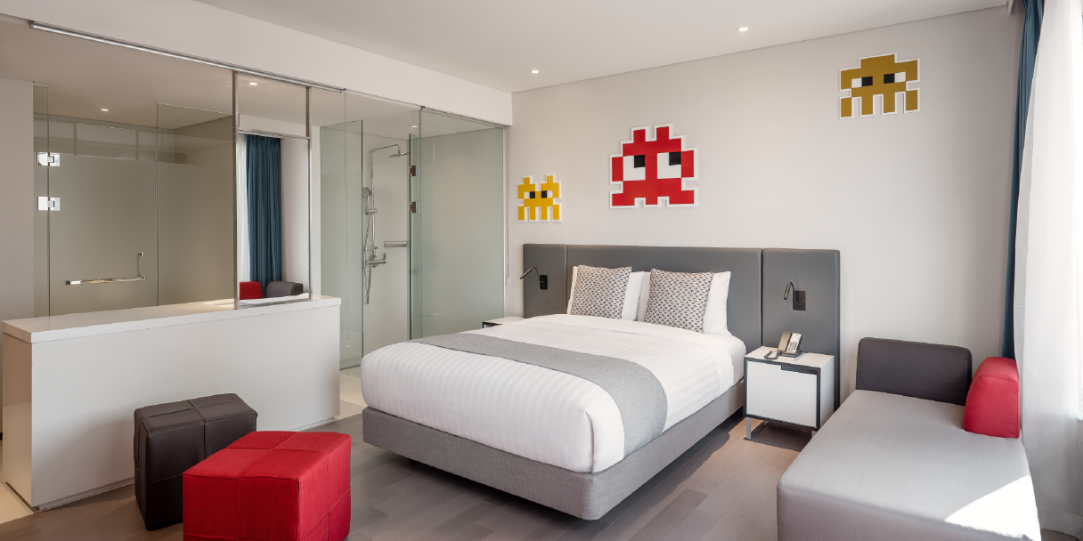 보다 넓은 크기의 주니어 스위트 더블룸에서는 심플하면서, 소통이 있고, 품격과 유쾌함이 있는 브랜드의 핵심 가치를 즐길 수 있습니다. 모듈식의 실용적인 가구와 사무용 공간, LED TV, 초고속 무료 인터넷(wifi)을 갖추어 다양한 여행목적에 최적화 되어있습니다.