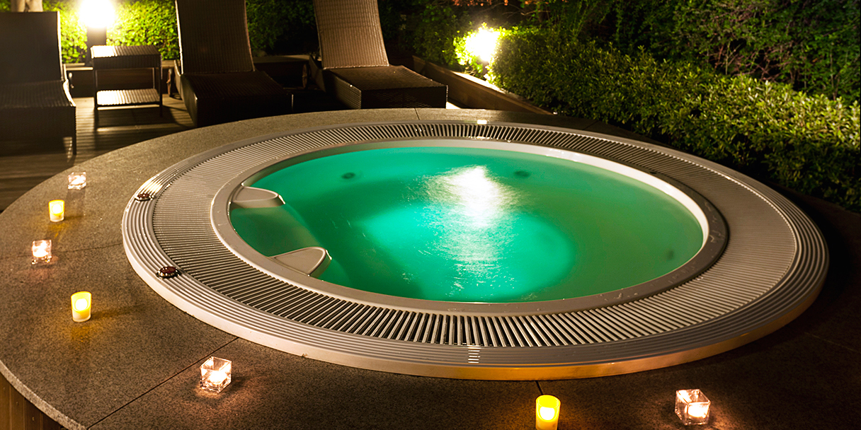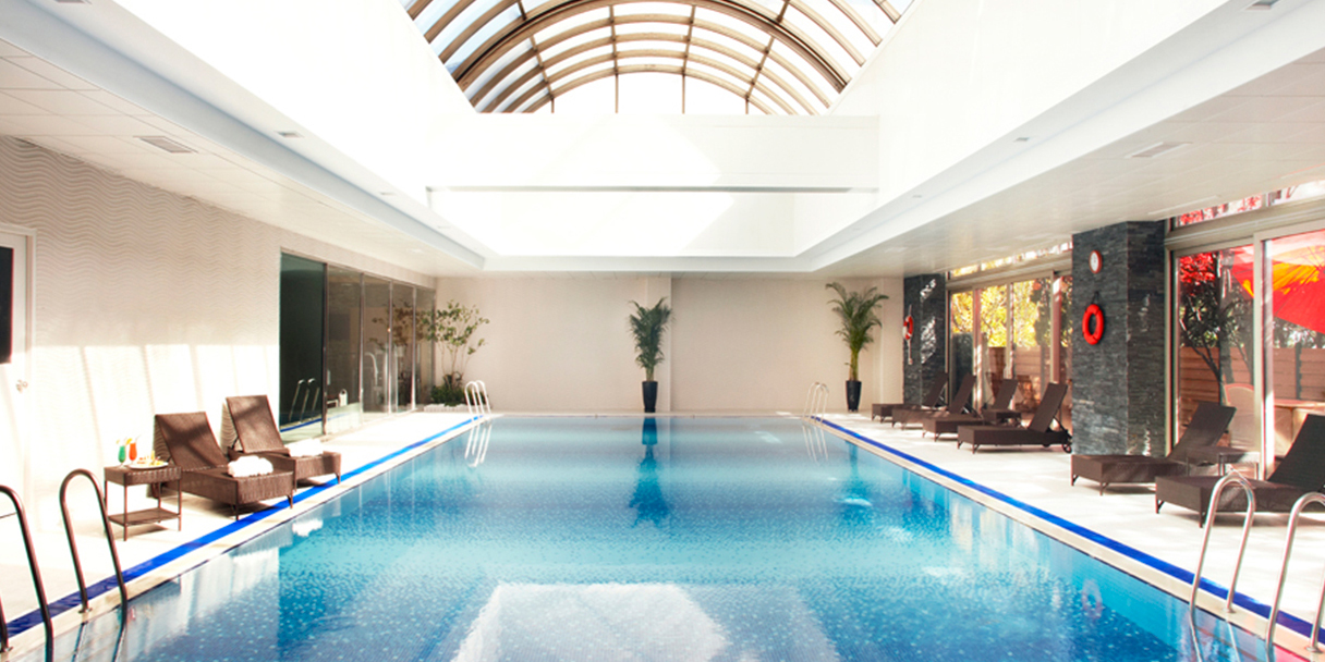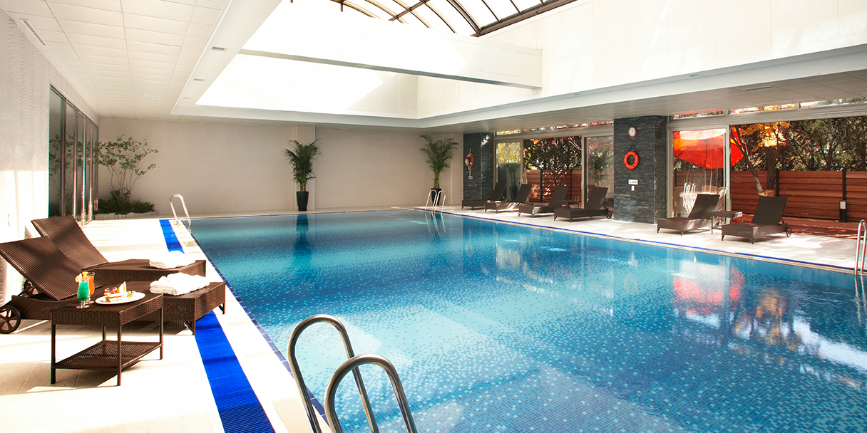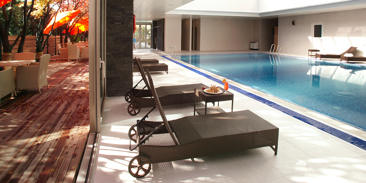 돔 형태의 유리 천정을 통해 자연 채광을 즐길 수 있으며, 천정의 돔이 열리면 야외풀장에서 수영하는 느낌을 줍니다. 또한 야외 스파가 있어 수영 중 쉬어갈 수 있게 해 드립니다.