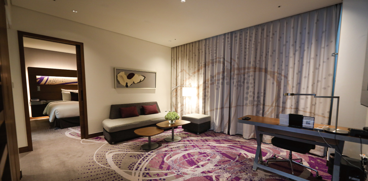 최신 시설을 갖춘 넓은 주니어스위트 룸은 응접실과 편안한 침실이 분리되어 있습니다.