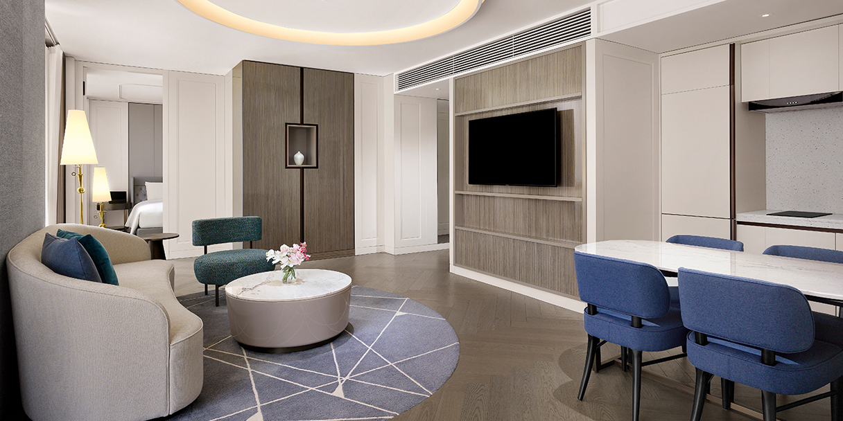 도심 속에 자리한 쟈뎅 디베르(Jardin d'Hiver)의 야외 정원을 조망할 수 있는 원 베드룸 디럭스 스위트는 66.84㎡의 여유로운 공간을 자랑하며 크림, 그레이 톤의 인테리어와 금속 몰딩 장식 포인트가 아늑하면서도 모던한 객실을 연출합니다. 장기 투숙객들을 위한 주방 시설, 세탁기 등 편리한 객실 설비와 서비스드 레지던스 전용 로비, 피트니스, 실내 수영장 등 다양한 부대시설로 더욱 편안한 시간을 선사합니다.