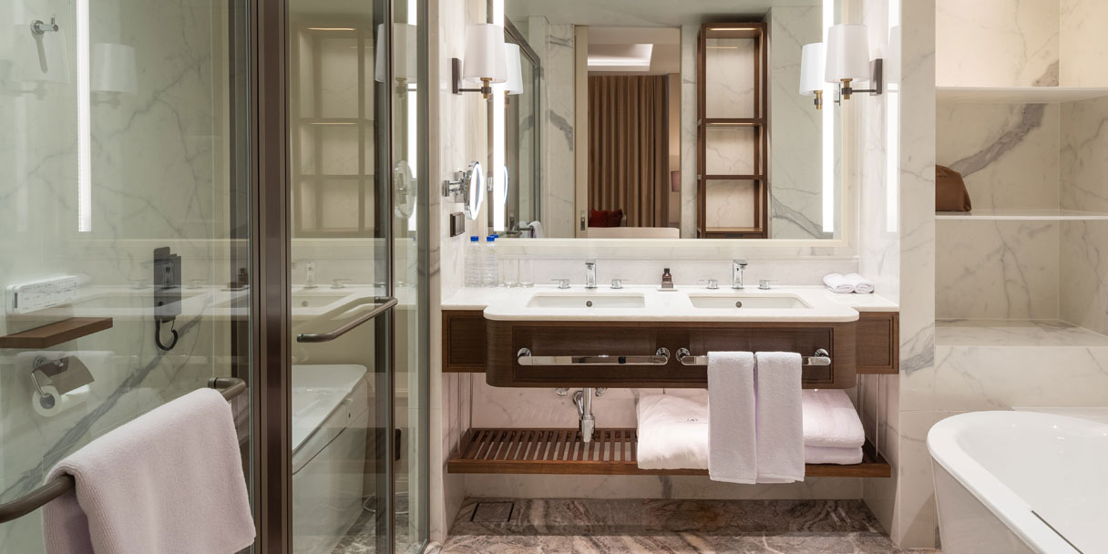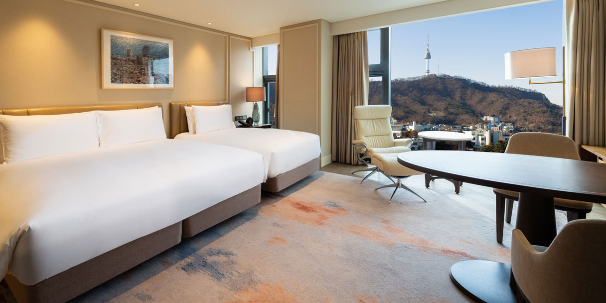 프리미엄 이그제큐티브 객실은 한국의 전통미를 현대적으로 재해석한 격자무늬 인테리어와 원목과 대리석이 선사하는 안락함과 세련미를 느낄 수 있는 객실 경험을 제공합니다. 남산의 풍광을 품은 통창 인테리어를 통하여 도심 속 힐링의 시간을 느껴보시길 바랍니다.
