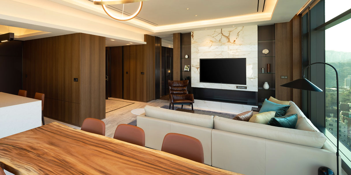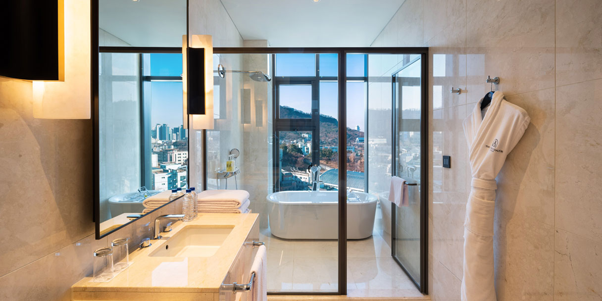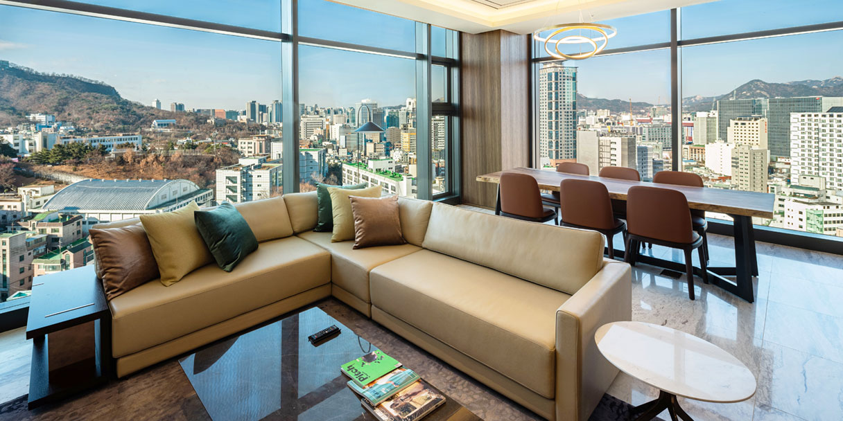 통 유리창을 통해 남산의 전경 및 서울의 아름다운 파노라마 뷰를 즐길 수 있으며, 여유롭고 넓은 거실과 고급스럽게 꾸며진 별도의 침실, 라이브러리 그리고 키친 네트를 갖추어 보다 여유롭고 편안한 투숙 경험을 선사합니다.