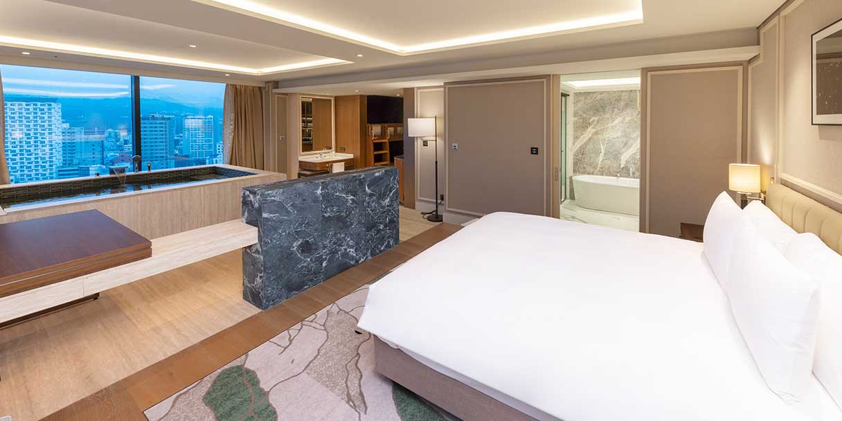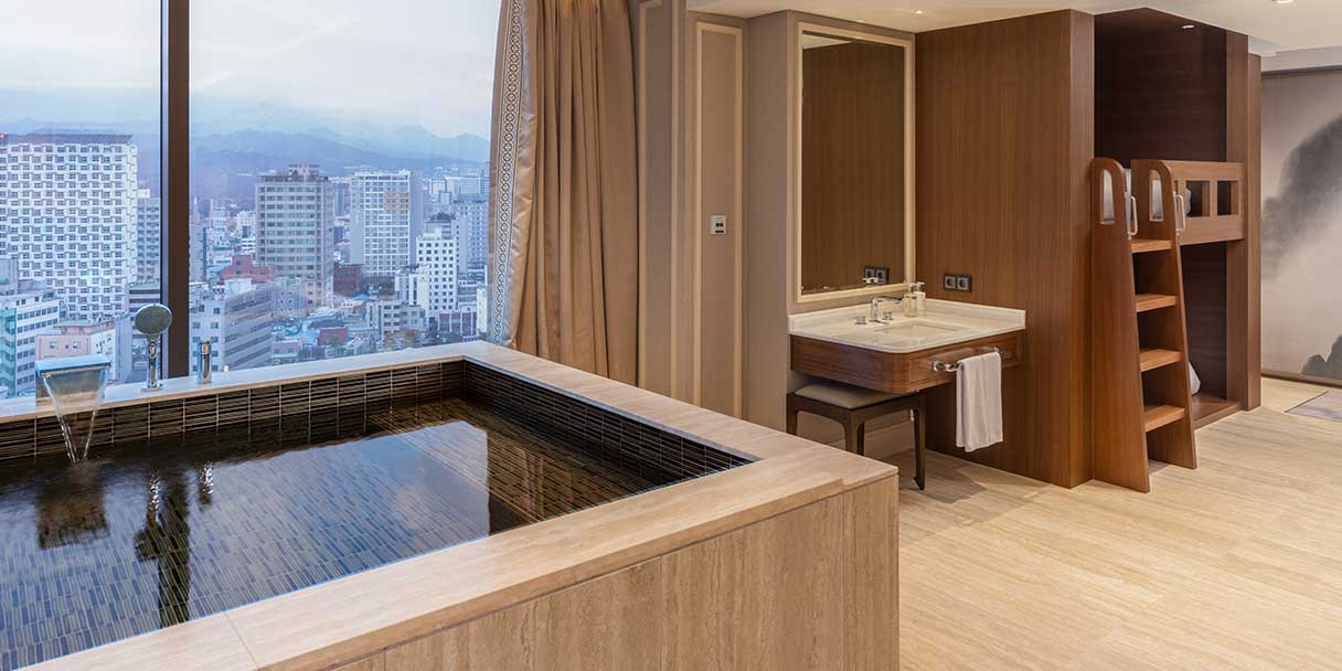 코너 스위트 객실은 남산의 아름다운 경치로 둘러싸인 코너 객실로 파노라마 뷰를 선사합니다. 전용 체크인 & 체크아웃 서비스를 제공하는 '클럽 앰배서더 라운지' 이용이 가능한 객실로 킹사이즈 베드 1개와 벙커 베드 1개가 갖춰져 있습니다. 객실 내 전용 풀(프라이빗 풀)은 탁 트인 남산 뷰를 보며 여유롭고 편안한 휴식을 즐길 수 있습니다.